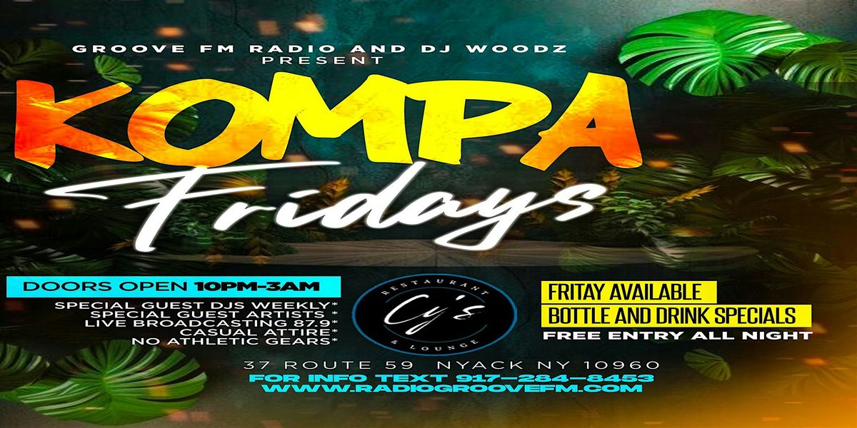 Welcome to Kompa Fridays formerly Kompa Thursdays. Summer is over, school is back in session, therefore we have moved over to Fridays to make it more convenient for you. Great music, network, food, drink specials, and more. Absolutely FREE entry on guestlist. Simply text the word “FREE” along with your first and last name to 917-284-8453. Doors open at 10pm. www.RadioGrooveFm.com