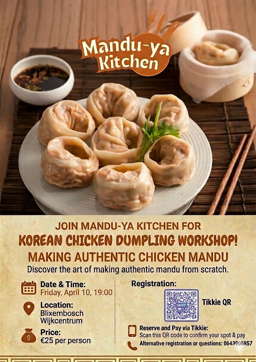 Tijdens deze speciale workshop leer je hoe je authentieke Koreaanse dumplings helemaal vanaf nul maakt – inclusief het deeg voor de dumplingvellen! We delen zelfs de geheime signatuurrecepten van Mandu-ya. Kom langs voor een unieke ervaring en leer de kunst van Koreaanse mandu!