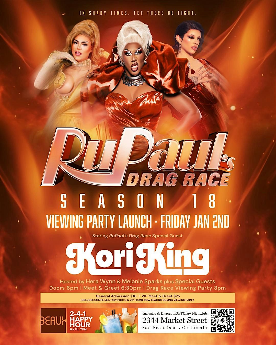 Get ready for a drag-tastic night at Beaux! Join us on January 2, 2026 to watch the premiere of Season 18 of Rupaul's Drag Race with the sickening Kori King. It's going to be a night filled with glitter, drama, and all the Tea, our girls will not be holding anything back! Don't miss out on the shade. Get your VIP ticket now with a complimentary photo with Kori King and seating during the viewing party to catch all the drama.