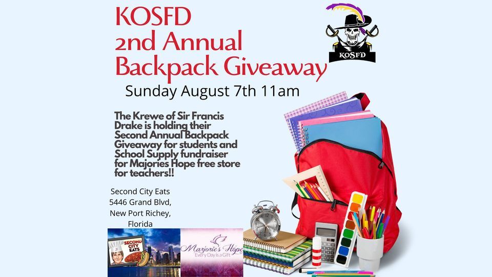 The Krewe of Sir Francis Drake is holding their Second Annual Backpack Giveaway for students and School Supply fundraiser for Majories Hope free store for teachers!! https://marjorieshope.com .. We hope to double the amount of backpacks we give away and the school supplies donated!!! Will be held at Second City Eats in New Port Richey!!!