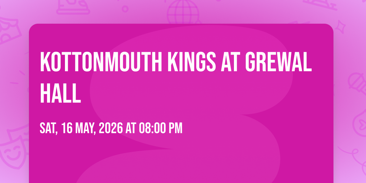 π Welcome to Kottonmouth Kings at Grewal Hall, where the impossible becomes possible and dreams take flight! ποΈ Join us at Grewal Hall in the heart of Lansing, MI for an event that will redefine your expectations. π On May 16th, 2026 at 08:00 PM, witness the transformation of space and time into something truly magical. β¨ It's a curated experience combining the best of innovation, entertainment, and community spirit, creating moments that will be remembered for years to come. Whether you're a first-time visitor or a seasoned enthusiast, prepare to be amazed. π Book now to ensure your place in this unforgettable experience!