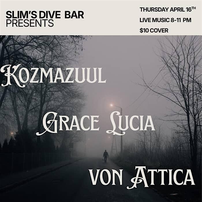 Kozmazuul (funk punk) with Grace Lucia (indie pop/rock) and Von Attica (power rock) will be at Slim’s on April 16th, 8-11pm!About this Event