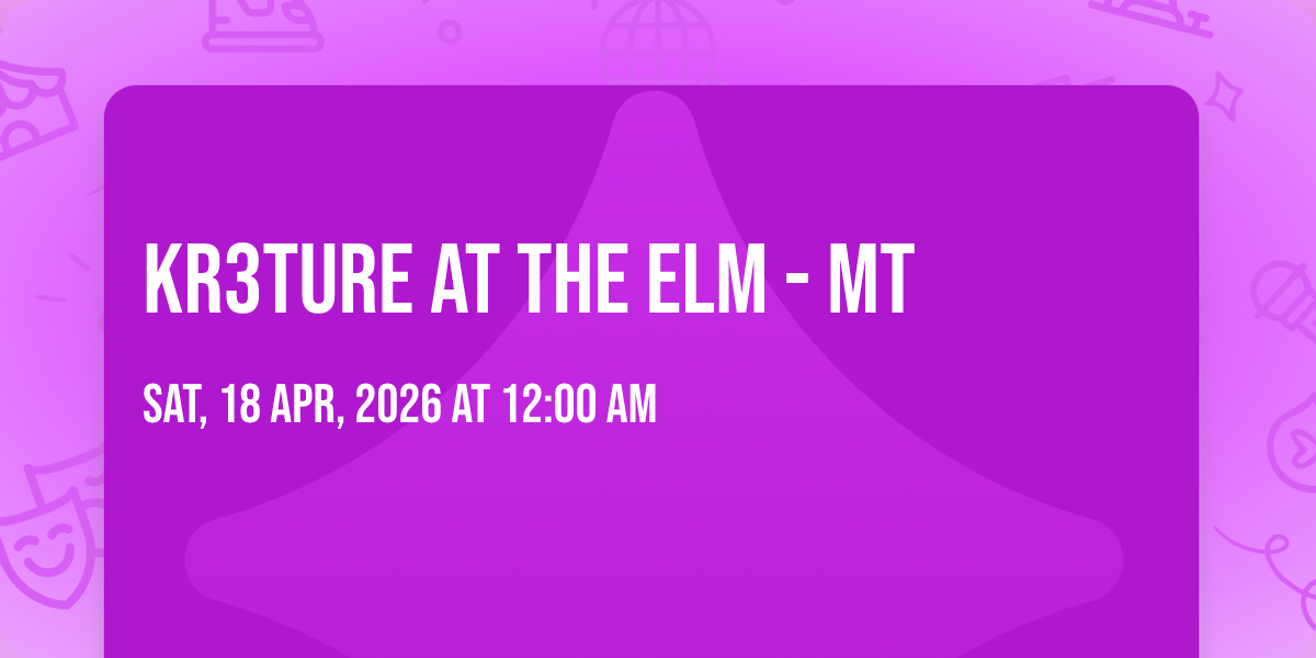 🎉 Welcome to KR3TURE at The Elm - MT, where dreams come alive and possibilities are endless! 🏛️ Join us at The Elm - MT in the heart of Bozeman, MT for an event that defies expectations. 📅 On April 18th, 2026 at 12:00 AM, be part of something truly extraordinary as we bring together innovation, entertainment, and pure magic. ✨ Every aspect has been carefully designed to ensure an unforgettable experience for all our guests. Whether you're seeking adventure, inspiration, or simply a break from the ordinary, this event promises to deliver beyond your wildest dreams. 🎊 Prepare for a journey into the extraordinary!