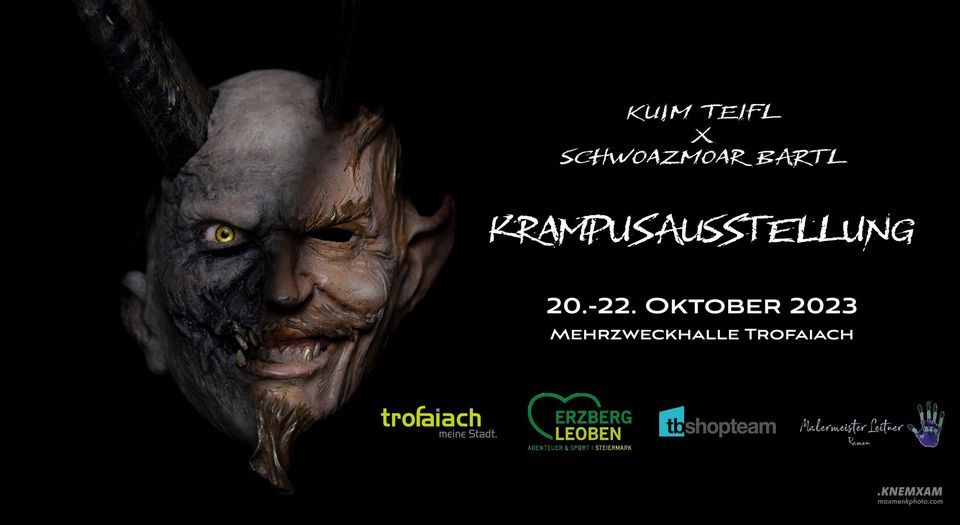 Heuer ist es so weit, zum ersten Mal veranstalten die beiden Vereine Kuim Teifl und Schwoazmoar Bartl eine Krampussausstellung. Mit über 45 Ausstellern, darunter 30 einheitliche Krampusgruppen sowie einige der besten Maskenschnitzer aus ganz Österreich, könnt ihr die Vielfalt und Kunstfertigkeit dieses alten Brauchs hautnah erleben.Die Krampusausstellung in Trofaiach ist nicht nur die größte ihrer Art in der Region rund um den Erzberg, sondern auch eine einzigartige Gelegenheit, die Kultur und Tradition des alten Brauchtums bei freiem Eintritt zu erkunden. Taucht ein in die faszinierende Welt der Krampusse & Perchten, bewundert die kunstvollen Masken und seid live dabei, wenn die Maskenschnitzer ihre neuesten Kunstwerke präsenterien!