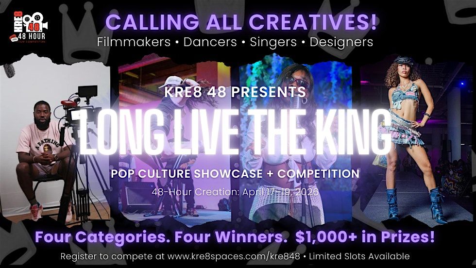 Selected participants will debut their completed work LIVE during the Long Live The King Showcase at Kre8 Spaces on April 25, 2026 in front of a public audience and guest judges.
