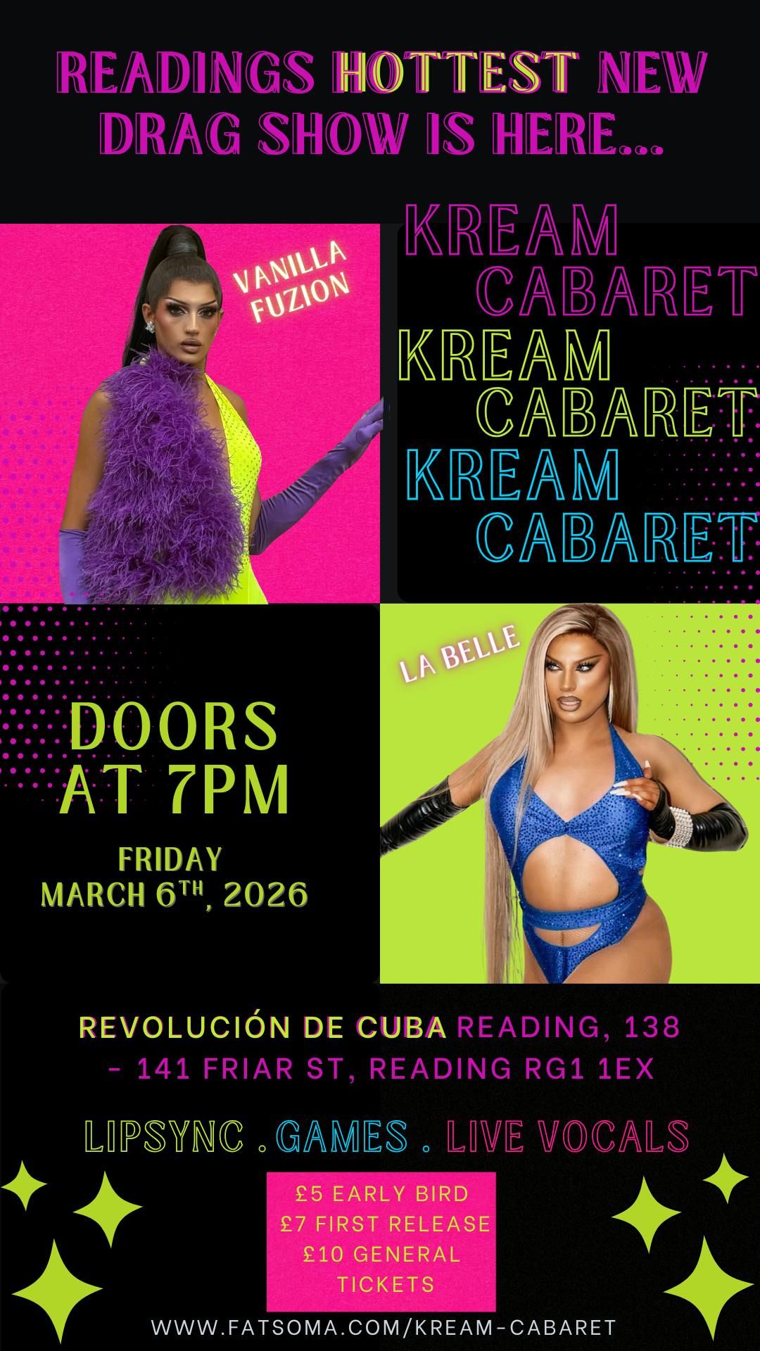 Reading’s hottest new drag show has arrived!Get ready for a night of pure drag excellence at Kream Cabaret, bringing high-energy performances, fierce fashion, and unapologetic glamour to Revolución de Cuba, Reading.