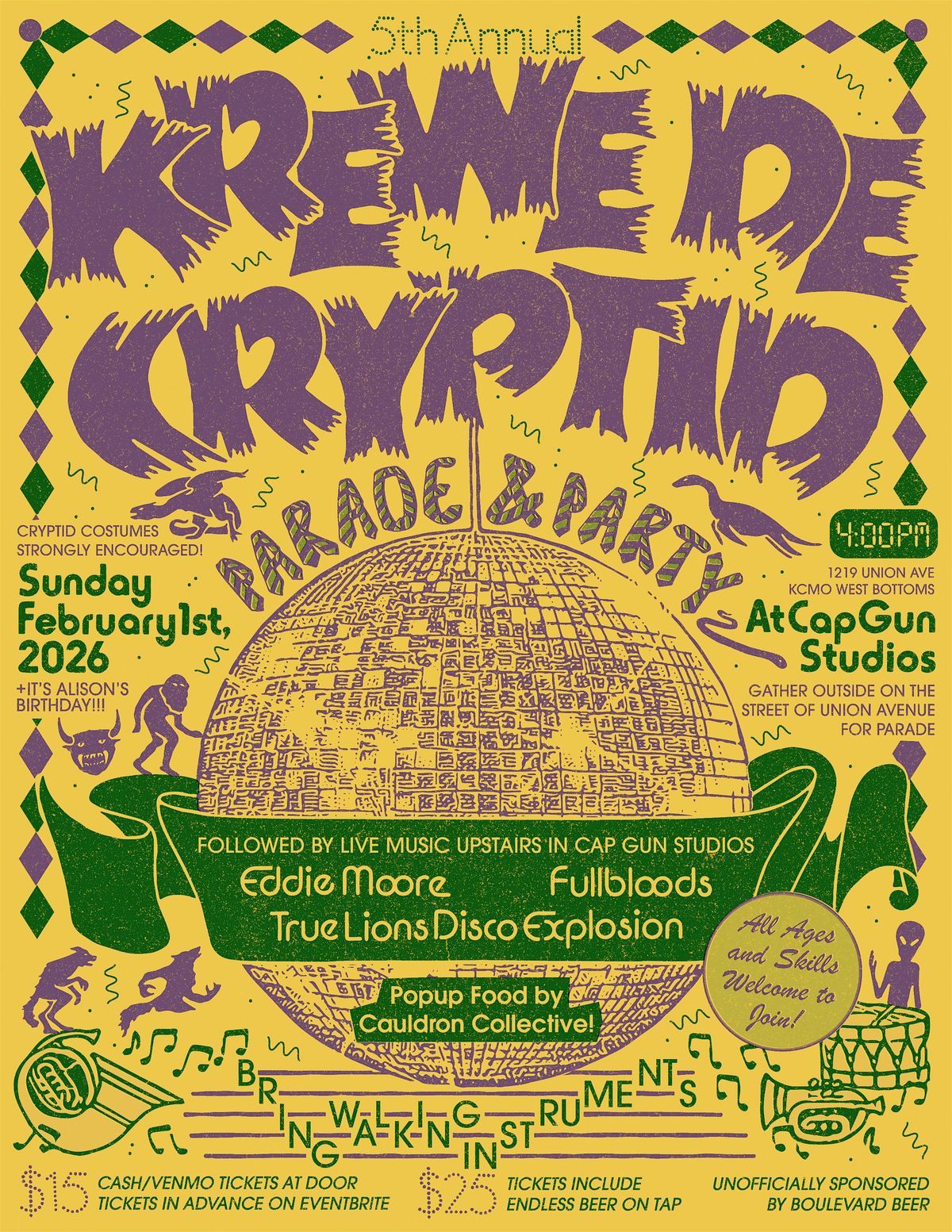 February 1, 2026! All are welcome!!! Join the parade through the West Bottoms and stick around for the show upstairs in Cap Gun Studios! Bring your family and friends! Wear a warm costume and have fun with us! We gather at 4:00pm on Union Avenue outside The Ship and assemble all the walking instruments! We’re talking horns, drums, woodwinds, strings, bells, whistles, accordions, and more! Costumed cryptids and general merrymakers! Sass-A-Brass and Wyco Psychos will get the march started! The parade ends back at Cap Gun Studios, transformed into a Mardi Gras Cryptid Wonderland! We have a full evening of live music from Eddie Moore, True Lions Disco Explosion, and Fullbloods! Purchase your tickets to the show for $15, or a $25 ticket includes unlimited complimentary Boulevard beverages while supplies last! The parade portion of the event is FREE but wristbands are required to stay for live music! Cauldron Collective will be back with their delicious vegan fare available for purchase!