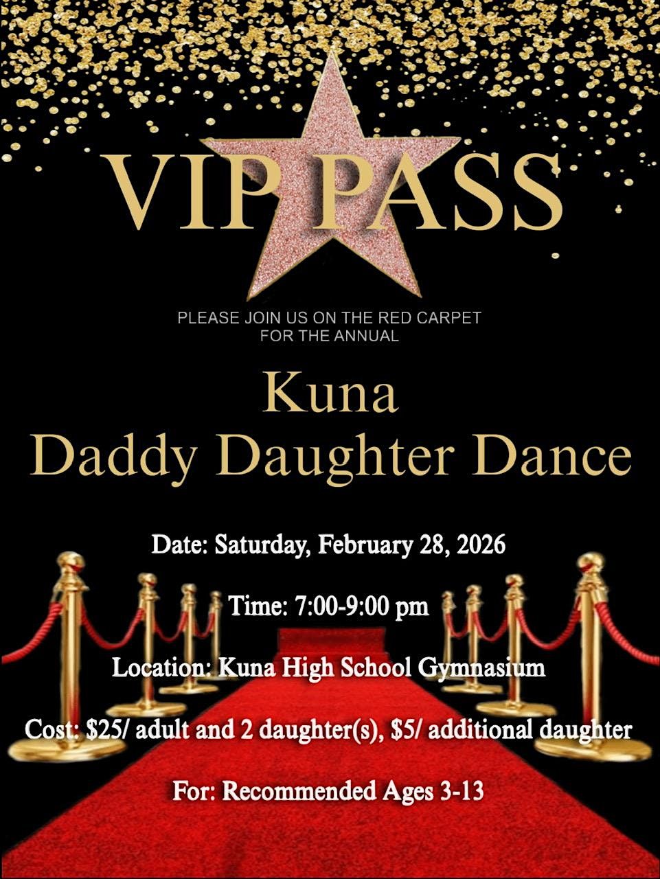 Get ready for an unforgettable night at the Kuna Daddy Daughter Dance 2026! We are "Rolling out the Red Carpet" for a night of Hollywood Glamour! We are excited to create special memories between dads and their daughters. Expect music, dancing, and lots of smiles in a relaxed and welcoming atmosphere. Flowers, treats and pictures are available at an extra cost. Free Photo booths are on-site!