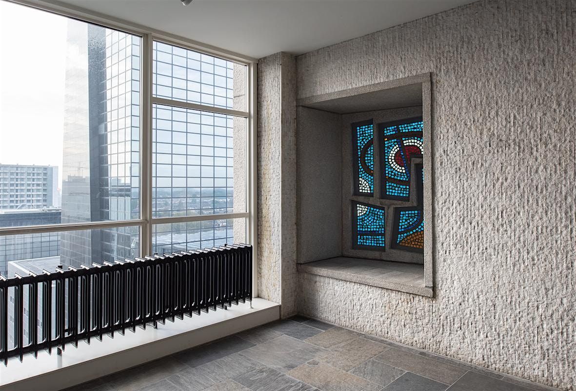 Aan de gevel bevinden zich de bekende glas-in-betonkunstwerken van Louis van Roode, die het trappenhuis prachtig doen kleuren. In het gebouw bevindt zich echter nog veel meer wederopbouwkunst! Je ontdekt alle verschillende kunstwerken in deze speciale kunsttour.