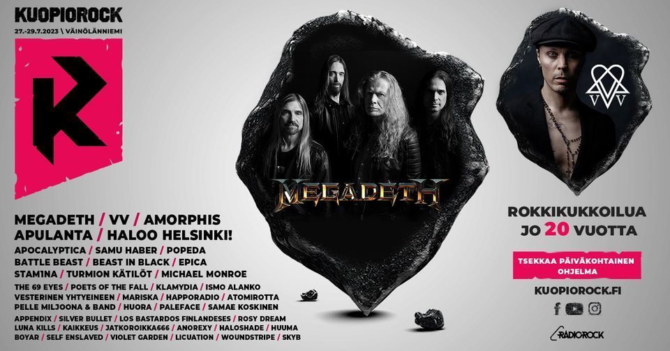 Juhlamenussa mukana Megadeth ⚡ VV ⚡Amorphis ⚡ Apulanta ⚡ Haloo Helsinki! ⚡ Apocalyptica ⚡ Samu Haber ⚡ Popeda ⚡ Battle Beast ⚡ Beast In Black ⚡ Epica ⚡ Stam1na ⚡ Turmion Kätilöt ⚡ Michael Monroe ⚡ The 69 Eyes ⚡ Poets of the Fall ⚡ Klamydia ⚡ Ismo Alanko ⚡ Vesterinen Yhtyeineen ⚡ Mariska ⚡Happoradio ⚡ Atomirotta ⚡ Pelle Miljoona & Band ⚡ Huora ⚡ Paleface ⚡ Samae Koskinen ⚡ Appendix ⚡ Silver Bullet ⚡ Lost Bastardos Finlandeses ⚡ Rosy Dream ⚡ Luna Kills ⚡ Kaikkeus ⚡