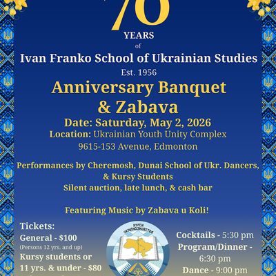 Info: Performance by Cheremosh, Dunai School of Ukrainian Dancers and Kursy Students. Silent Auction. Late lunch and Cash bar.