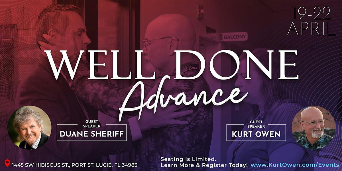 The Kurt Owen Ministries' 2026 Well Done ADVANCE is a transformational gathering designed to help you reset, refocus, and move forward in every area of life—spirit, soul, body, finances, and relationships. This conference is for believers who know there is more—more clarity, more fruit, more purpose—but need encouragement, fresh direction, renewed strength, and practical How-To Steps to walk it out.