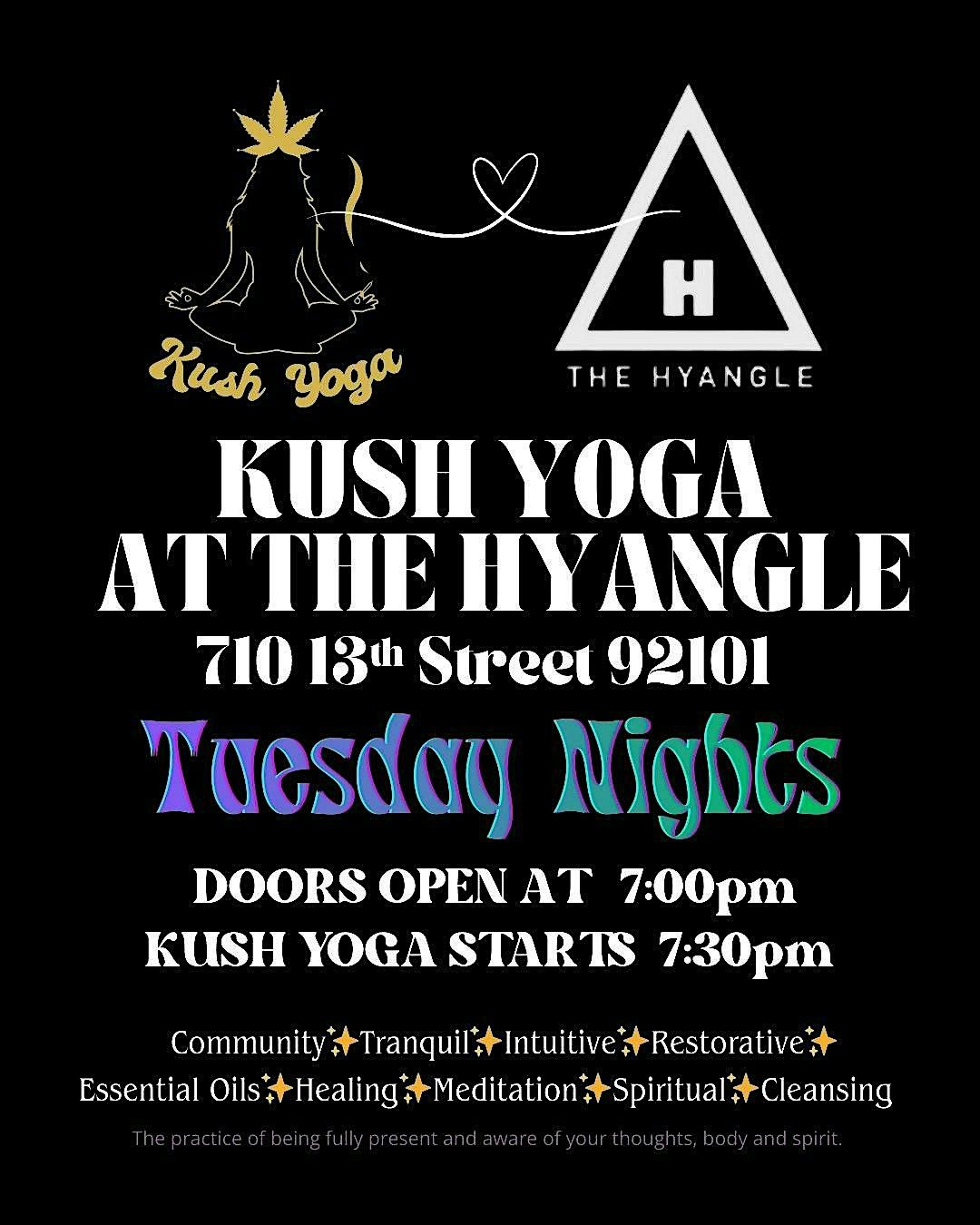 Welcome to Kush Yoga's Tuesdays All-Levels Resore & Ascend Session at The Hyangle in San Diego's East Village. Doors open at 7pm for community elevation before Kush Yoga session at 7:30pm. Also featuring Drea's healing Juices for purchase. Bring your yoga mat and good vibes! Tuesdaze has begun!
