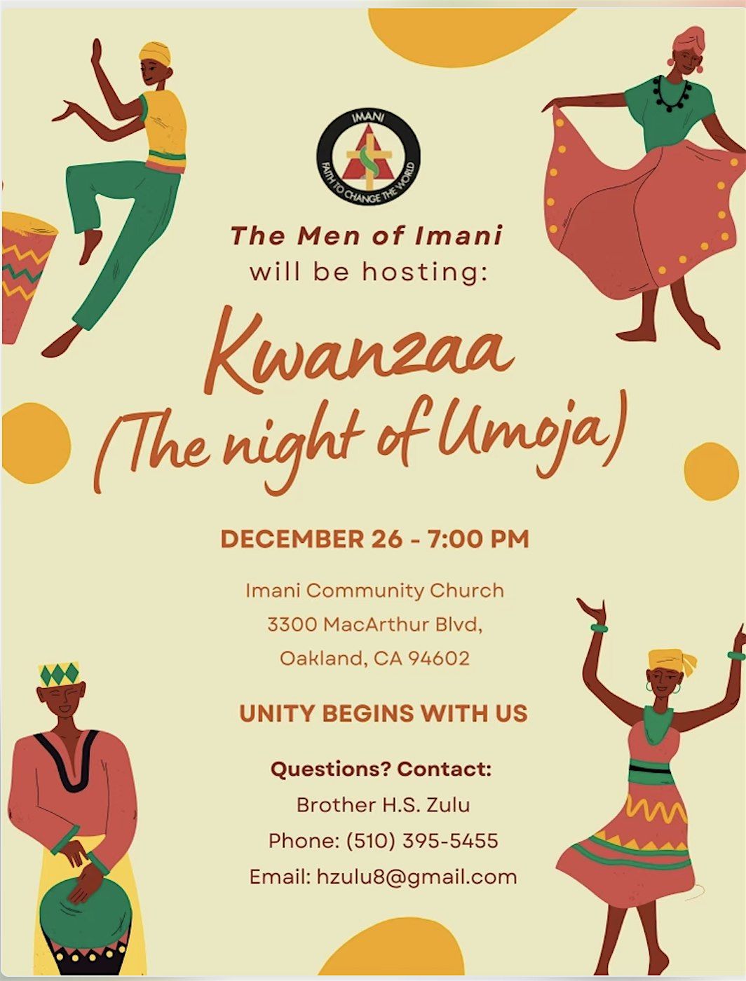 Join us at Imani Community Church for a Kwanzaa celebration on the day of Umoja (Unity). Kwanzaa is a non-religious, Pan-African cultural holiday (Dec 26–Jan 1) that honors African heritage and the Seven Principles (Nguzo Saba). Expect community, music, storytelling, and reflection. Everyone is welcome, whether you’re new to Kwanzaa or returning. We hope to see you there!