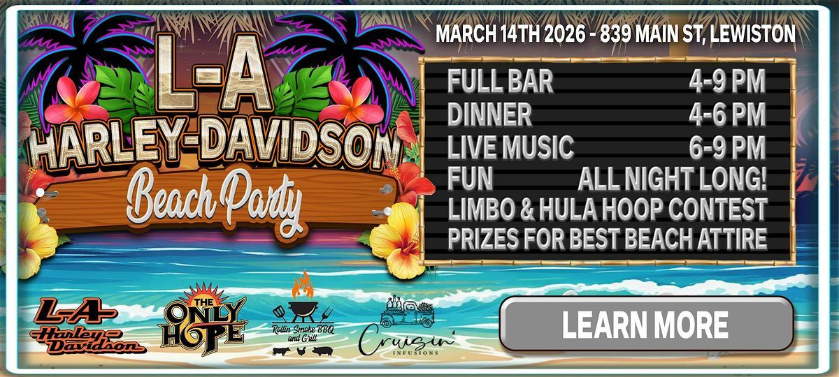 Winter doesn’t stand a chance — we’re bringing the beach to Lewiston! Join us at L-A Harley-Davidson, 839 Main Street, for a high-energy Beach Party packed with food, drinks, music, and tropical-themed fun. This event is free to attend, with food and beverages available to purchase throughout the evening.