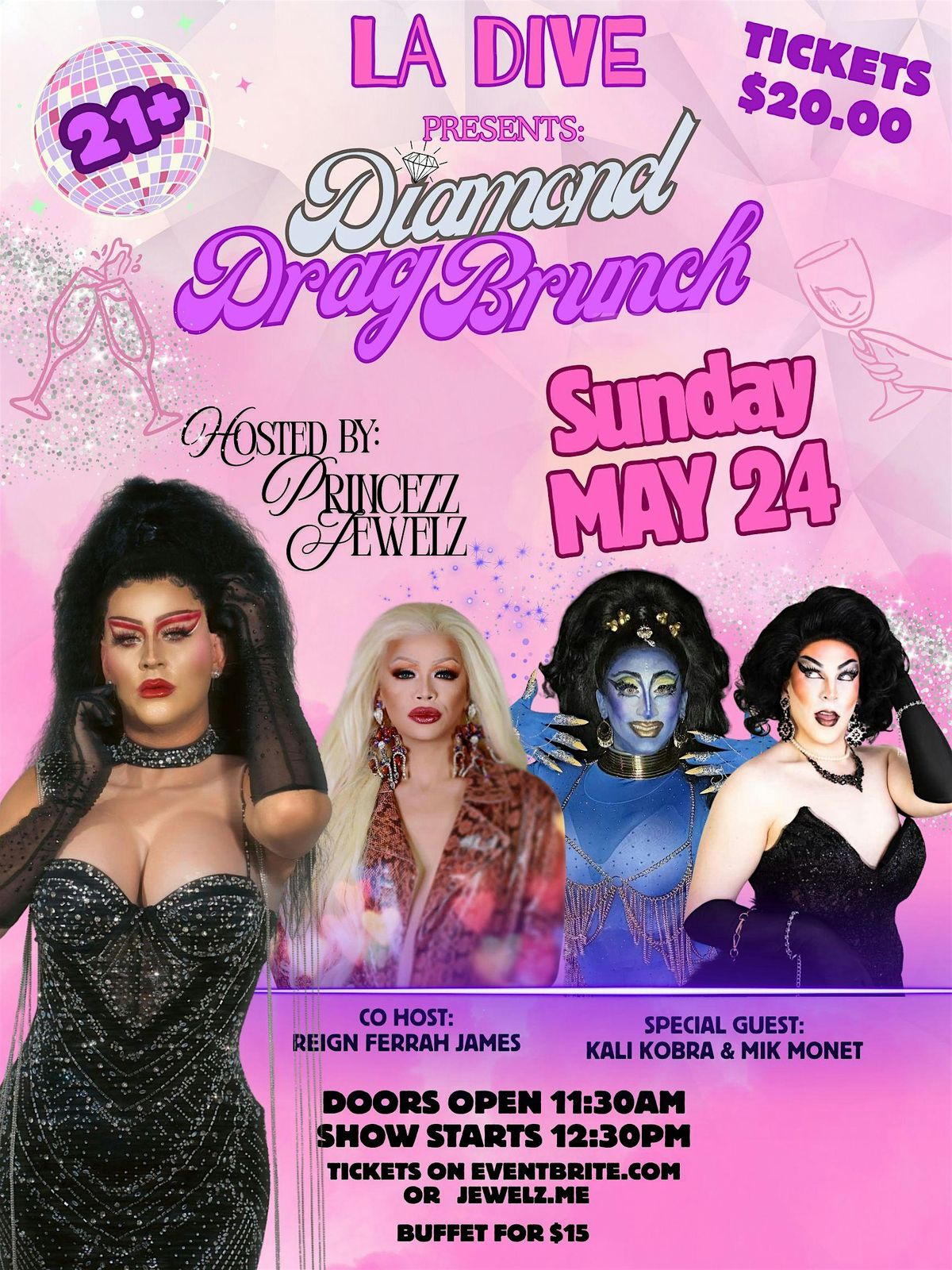 Join us at La Dive for Diamond Drag Brunch on May 24. We have a fierce and fabulous show for you featuring an amazing cast of Queens