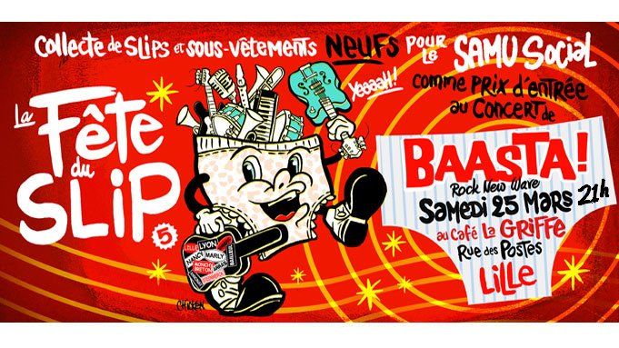 "BAASTA" en concert à la Griffe, le Samedi 25 MARS à 21h, dans le cadre de la Fête du Slip, un événement festif et solidaire initié par l'association Le Car Podium.Le principe est simple : vous venez passer une bonne petite soirée et accédez au concert en échange d'un don de sous-vêtements neufs (slip, culotte, caleçon, boxer, soutien-gorge...) collectés au profit du Samu Social.