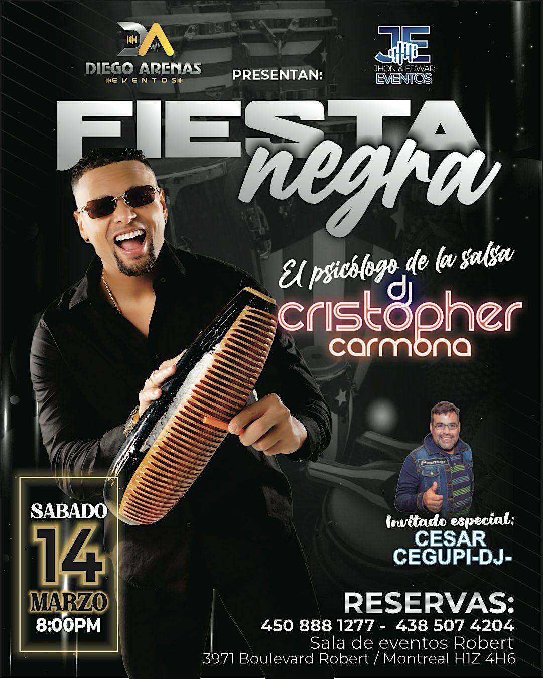 Ven y acompáñanos a disfrutar de una noche inolvidable de buena salsa. llega DJ Cristopher Carmona uno de los DJ más importantes de salsa en Colombia y el mundo. por Montreal como invitado especial DJ Cegupi. Trae tu instrumento y alista tu pinta para vivir la mejor fiesta de salsa en Montreal. Te esperamos !!