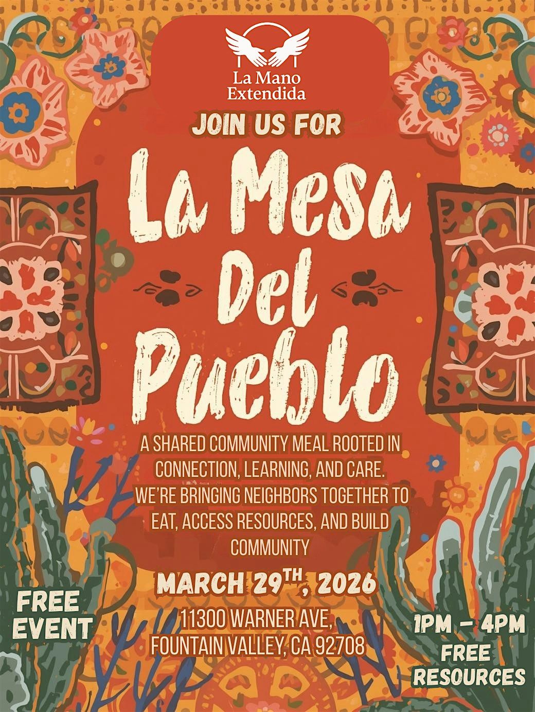 La Mesa del Pueblo is a free, community-centered gathering rooted in connection, learning, and care. Hosted by La Mano Extendida, this event brings neighbors together to share a meal, access free resources, and build meaningful community bonds in a welcoming and dignified space.
