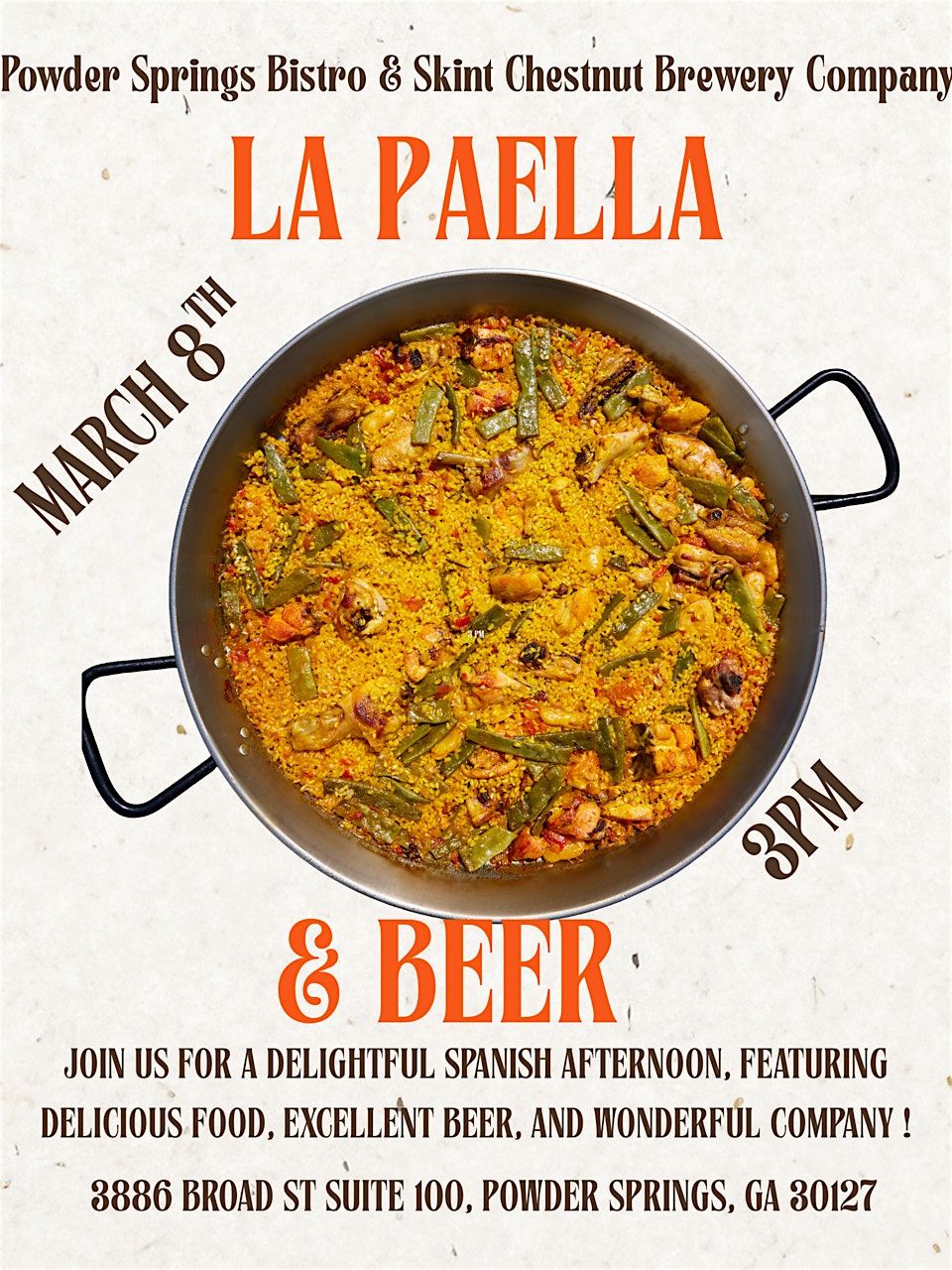 Join the Powder Springs Bistro and Skint Chestnut Brewing Company for a delicious afternoon of Paella and Beer.About this Event