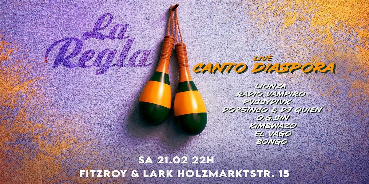 Con la fuerza de 35 mujeres arranca la primera Regla en 2026: Canto Diáspora en Vivo! Liderado por Carolina Riaño, el proyecto une voces y tambores de mujeres latinas para crear un espacio sonoro único, poderoso y arrebatador. La Rumba sigue con lxs mejores djs del ambiente tropical. Salsa Dura, Cumbia, Perreo, Rap Latino, Reparto, Baile Funk y otras cochinadas en dos pistas hasta las 5 de la mañana.