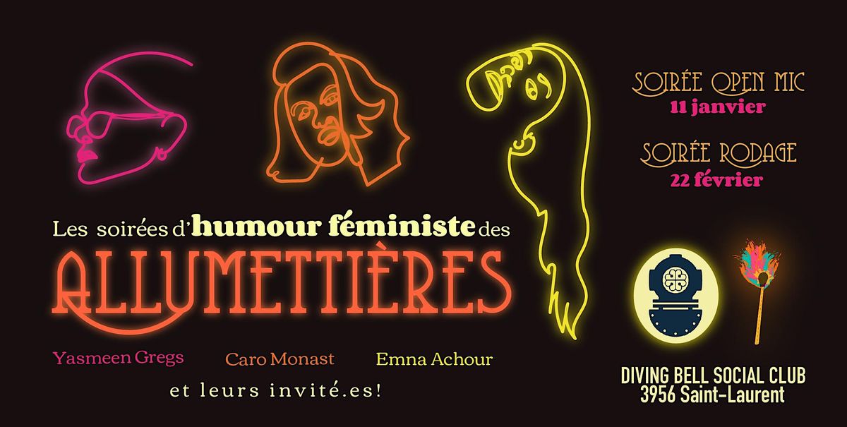 We’re BAAAAAACKKK! Joyeuses Fêtes en avance les chum.e.s ???? Les Allumettières débarquent au trop cool The Diving Bell Social Club / Club Social Le Scaphandre pour deux éditions mensuelles avec Emna Achour à l’animation, le 11 janvier pour le retour de notre soirée open mic et le 22 février pour une formule rodage avec des humoristes plus établi.e.s! En espérant que ce soit le début d’une longue collaboration ?