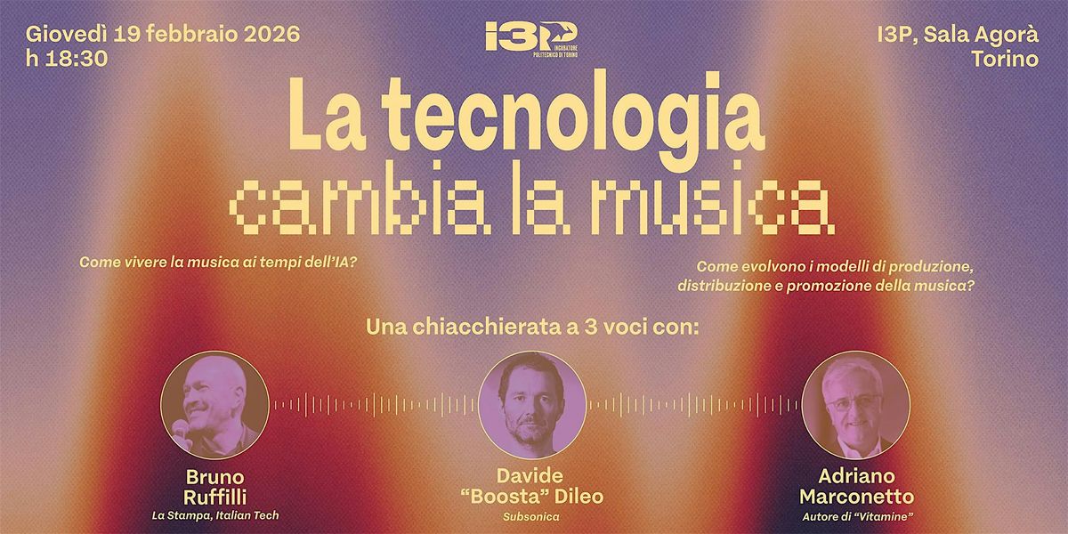 Per affrontare questo argomento, a cavallo tra arte e industria con un occhio puntato sull’attualità e al futuro, l’Incubatore di Imprese Innovative del Politecnico di Torino () ha organizzato un incontro tematico, “La tecnologia cambia la musica”, coinvolgendo tre esperti del settore. Davide “Boosta” Dileo, co-fondatore e tastierista dei Subsonica, condividerà le sue esperienze e riflessioni come compositore, produttore ed esploratore del suono; Bruno Ruffilli, Editorial Coordinator di Italian Tech e Senior Editor di La Stampa e Repubblica, offrirà una lettura dei trend osservati nei suoi trent’anni di attività giornalistica specializzata nella tecnologia; Adriano Marconetto, imprenditore, ex-collezionista musicale e autore del volume "Vitamine" (Cicles edizioni), rifletterà sull'evolversi dei modelli di business di chi opera nel mercato musicale.