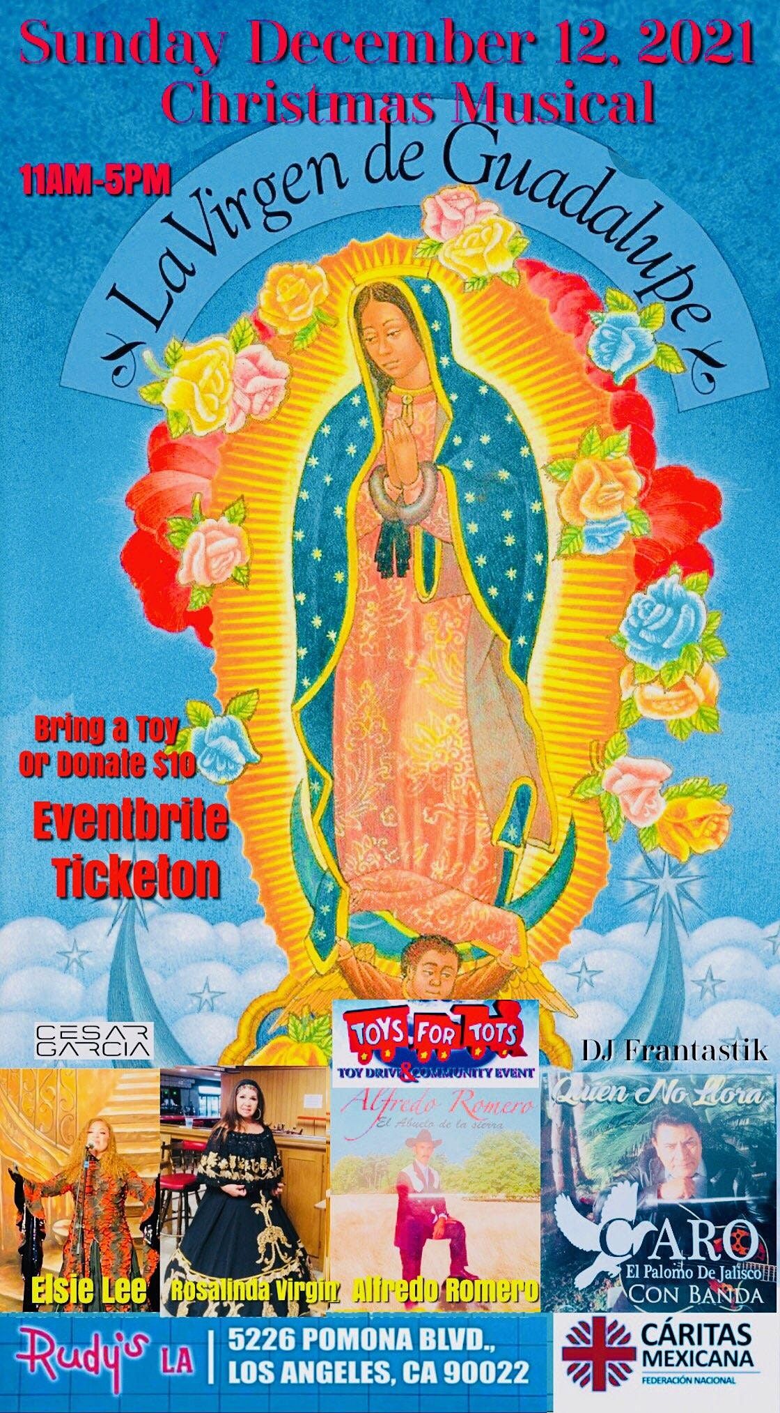 LOS ANGELES - Dec. 3, 2021 - PRLog -- RudysLA resturant located at 5226 Pomona Blvd, Los Angeles, CA will be hosting a Special Christmas Musical for our "La Virgen de Guadalupe" on Dec. 12th, 2021 from 11am to 5pm which they will also be featuring a Toy Drive and/or Donate $10.00 which will be donated to Caritas.org Mexicana.