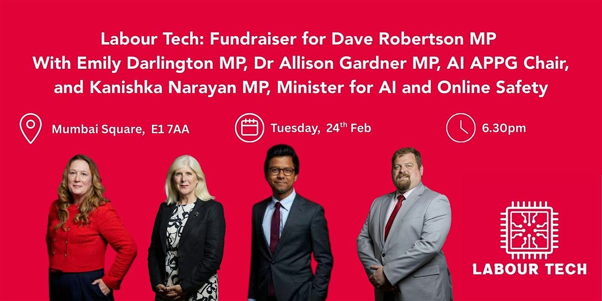 Join Labour Tech as we fundraise for Dave Robertson MP with Emily Darlington MP, Dr Allison Gardner MP, AI APPG Chair, and Kanishka Narayan MP, Minister for AI and Online Safety.