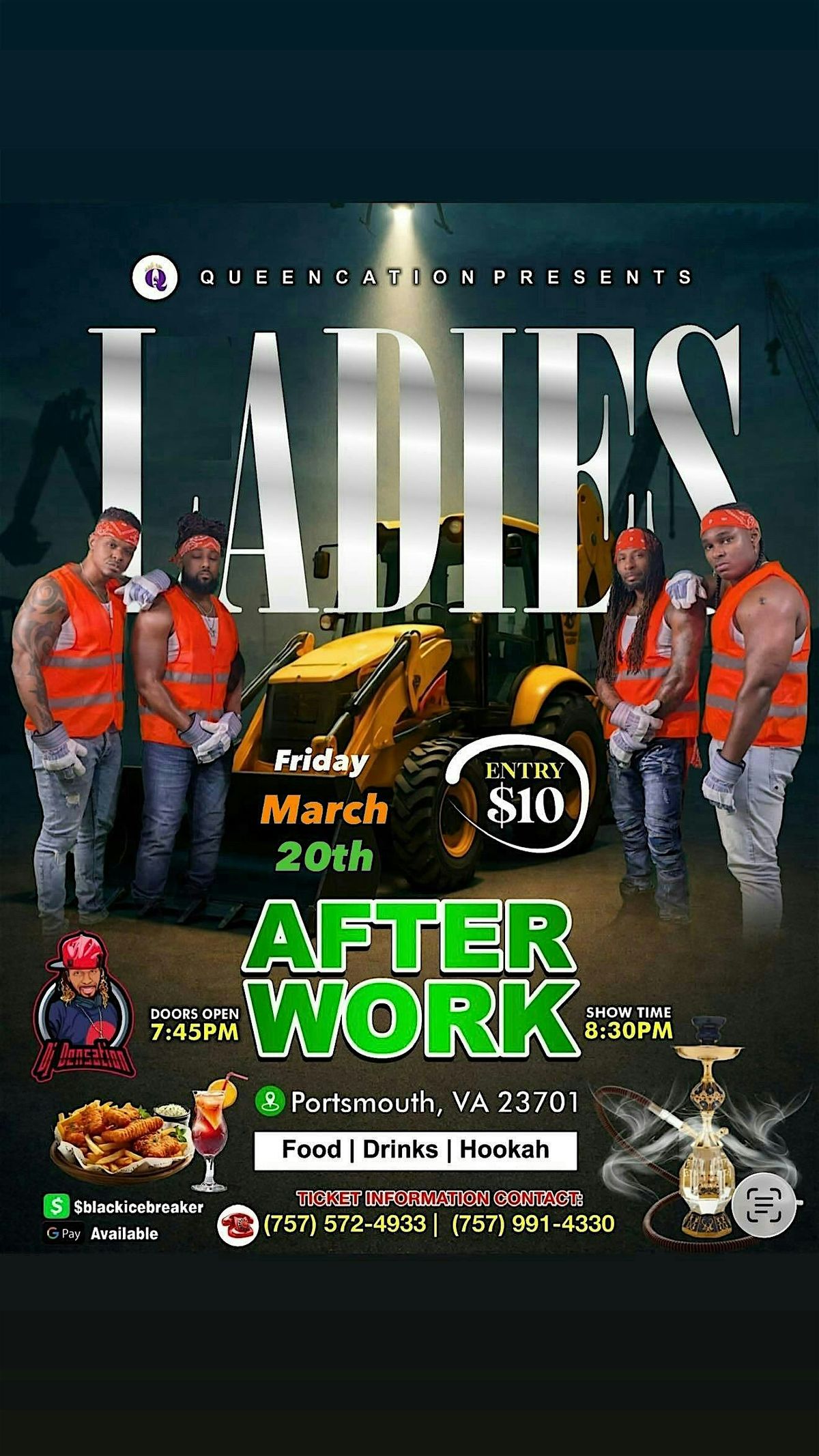 Ladies After Work is your exclusive, women-only escape held every third Friday in Portsmouth, Virginia (location to be announced), created for hardworking women of all lifestyles to unwind, laugh, and release the stress of the week. Enjoy an unforgettable night featuring exciting performances, interactive hot seats, great energy, and a fun, empowering atmosphere designed just for her eyes only. Bring your ones, bring your friends, and treat yourself to a night of entertainment, connection, and well-deserved fun after a long day—because you’ve earned it. #LadiesAfterWork #WomenOnlyEvent #AfterWorkVibes #StressReliefNight #PortsmouthVA #LadiesNightOut #UnforgettableShow #HotSeatsExperience #WorkingWomen #GirlsNightEnergy