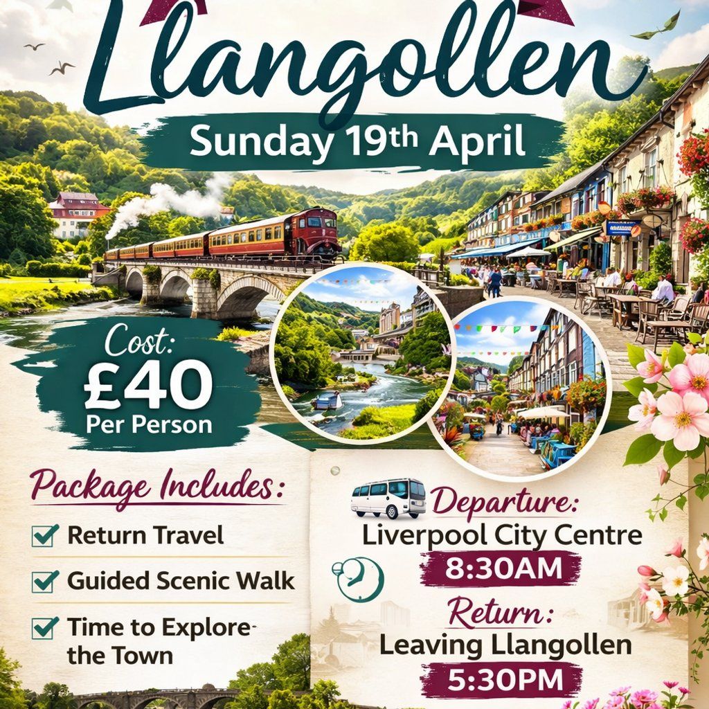 Ladies day trip to the beautiful Llangollen. Enjoy a guided walk followed by an optional lunch and free time to explore.