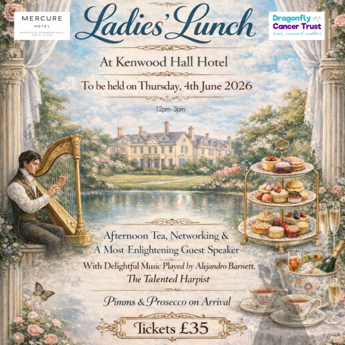 Guests will be welcomed with a glass of Prosecco or Pimm’s on arrival, followed by a beautifully curated afternoon tea in a relaxed and elegant setting. The afternoon will also feature an inspiring keynote speaker (to be announced) and live harp music from the wonderfully talented Alejandro Barnett, creating the perfect atmosphere for an afternoon of conversation, networking and celebration.