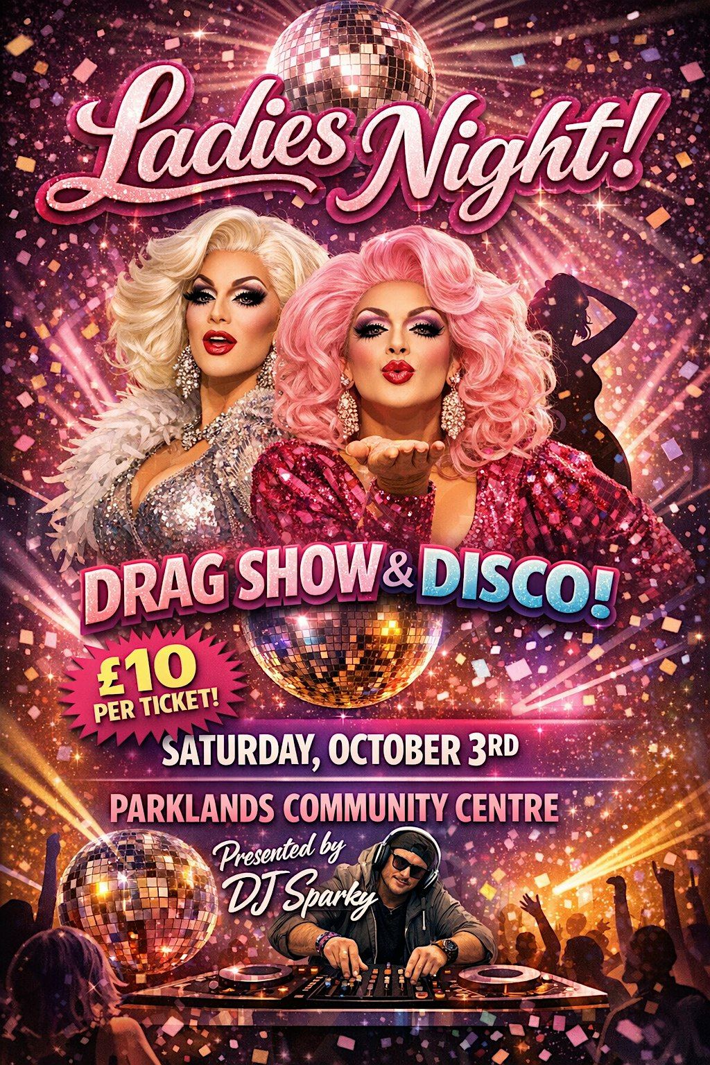 Get ready for a fabulous evening at the Parklands Community Centre! Join us on October 3, 2026 at 7:45 PM (BST) for a night full of glitter, glam, and groovy beats. Whether you're here to enjoy the dazzling drag performances or dance the night away, this Ladies Night promises fun and good vibes all around. Bring your friends and let’s make it a night to remember!