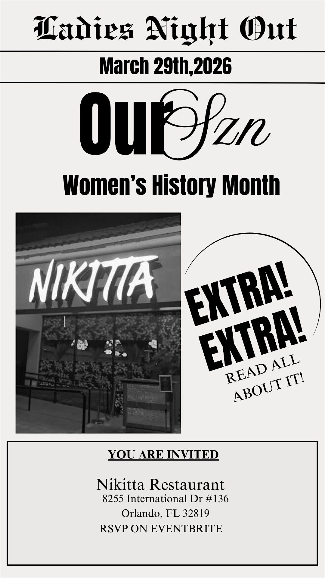 To close out Women’s History Month, let’s celebrate us simply for being amazing women Join us for a Ladies Night Out at Nikita Restaurant