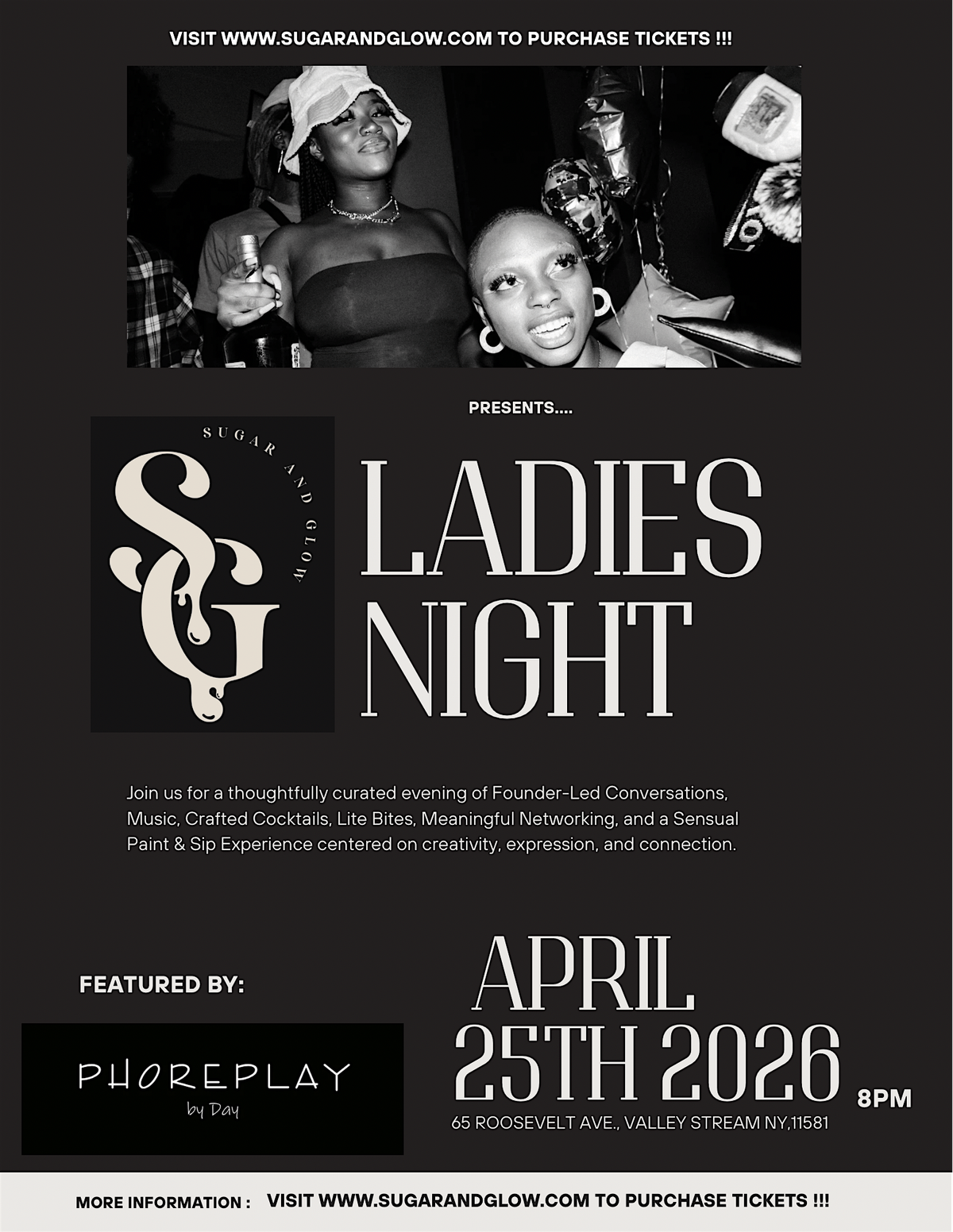 Gather your besties and join us in person for a night full of fun, glam, and good vibes. Whether you're looking to unwind, dance, or just enjoy some quality girl time, this is the place to be. Don’t miss out on the ultimate girls' night out experience at Sugar and Glow!