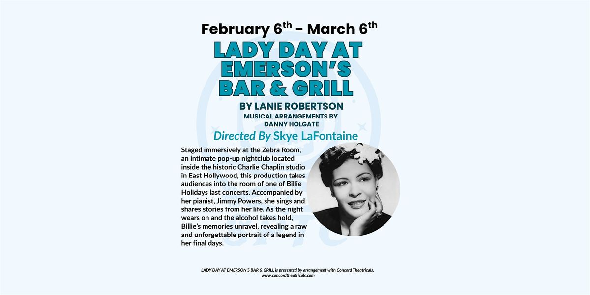 Space Pirates Theatre Collective presents an immersive and intimate staging of Lady Day at Emerson's Bar & Grill by Lanie Robertson, which recreates one of Billie Holiday's final concerts before her death. Directed by Skye LaFontaine, this production brings audiences into the Zebra Room, a vibrant pop-up nightclub located inside East Hollywood's Historic Charlie Chaplin Studio, for an unforgettable night with Billie Holiday as she performs a career-spanning set interlaced with stories from her life as an artist and civil rights icon. Produced and scenic-designed by Ben Zingos, this project continues SPTC's mission of providing immersive theatrical experiences for our community at an affordable price, while still paying all artists an equal, living wage.