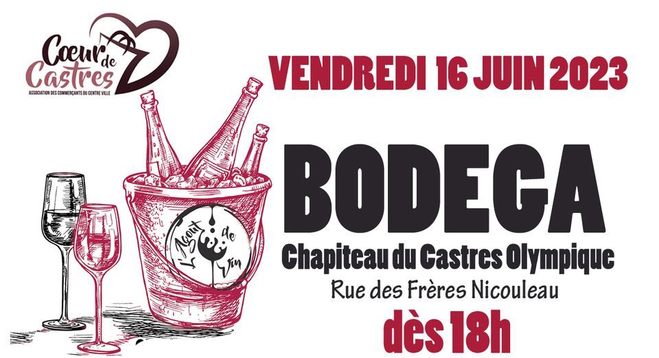 L'AGOUT DE VIN BODEGA : le vendredi 16 juin 2023L’association des commerçants du centre ville Cœur de Castres organise une soirée Bodéga ambiance festive et chaleureuse sous le chapiteau du CO le vendredi 16 juin 2023 dès 18h.