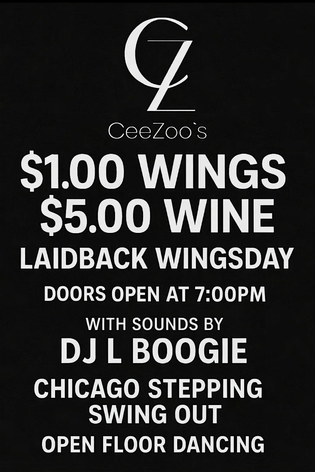 Get your mid-week vibes right at CeeZoo’s Laidback Wingsday Enjoy $1 wings and $5 wine while DJ L Boogie sets the mood for a smooth
