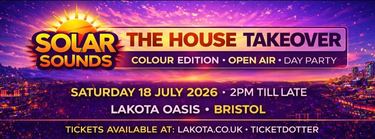 Solar Sounds returns with The House Takeover: Colour Edition — an open-air day party set to bring vibrant energy to Lakota Oasis. Known for delivering colourful and high-energy experiences, Solar Sounds continues its growing journey following a sold-out launch event. This edition brings together a powerful lineup of DJs, uniting some of the finest sounds in house music. From uplifting tech house to Afro house, tribal rhythms, soulful grooves, and underground dancefloor energy, the event promises an atmosphere built for music lovers, dancers, and the Solar Sounds community. Solar Sounds presents an unmatched lineup of elite DJs from London, Bristol, Birmingham, Cardiff, and Gloucester, showcasing a diverse and unified sound across the UK scene. Taking place on Saturday 18 July 2026 from 2PM till late, this open-air day party invites guests to soak up the summer vibes, experience live percussion from Dezy B on the bongos, and enjoy an unforgettable celebration of music, colour, and connection. With a rapidly growing reputation and strong momentum behind the brand, Solar Sounds continues to establish itself as one of Bristol’s most exciting and vibrant event brands. This is a limited capacity event and expected to sell out. Early arrival is strongly advised. LINE-UPARUN VERONESUPA DKISMETCOLDSTEPSG ZUESJEZTASPIDEY GTHE COLLECTIVECHELSSGEMIINIIZEBOBBY V DAVISCARLOS BARZRISKGOSHOTIMEPHONZBIG SHELLDANNY SPARKZDEZY B Expect sunshine, high energy, vibrant vibes, and an unforgettable atmosphere from start to finish. This is the Solar Sounds experience.Disclaimer: