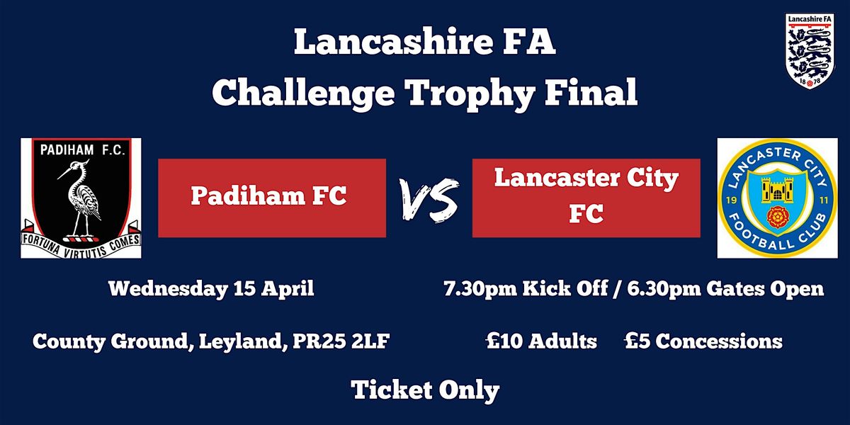 Join us for the Lancashire FA Challenge Trophy Final, on Wednesday 15 April 2026 at 7.30pm. Watch two top teams compete for silverware at the County Ground.