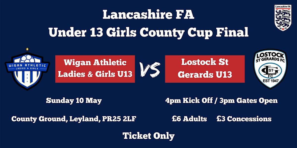 Join us for the Lancashire FA Under 13 Girls County Cup Final, on Sunday 10 May 2026 at 4pm. Watch two top teams compete for silverware at the County Ground.