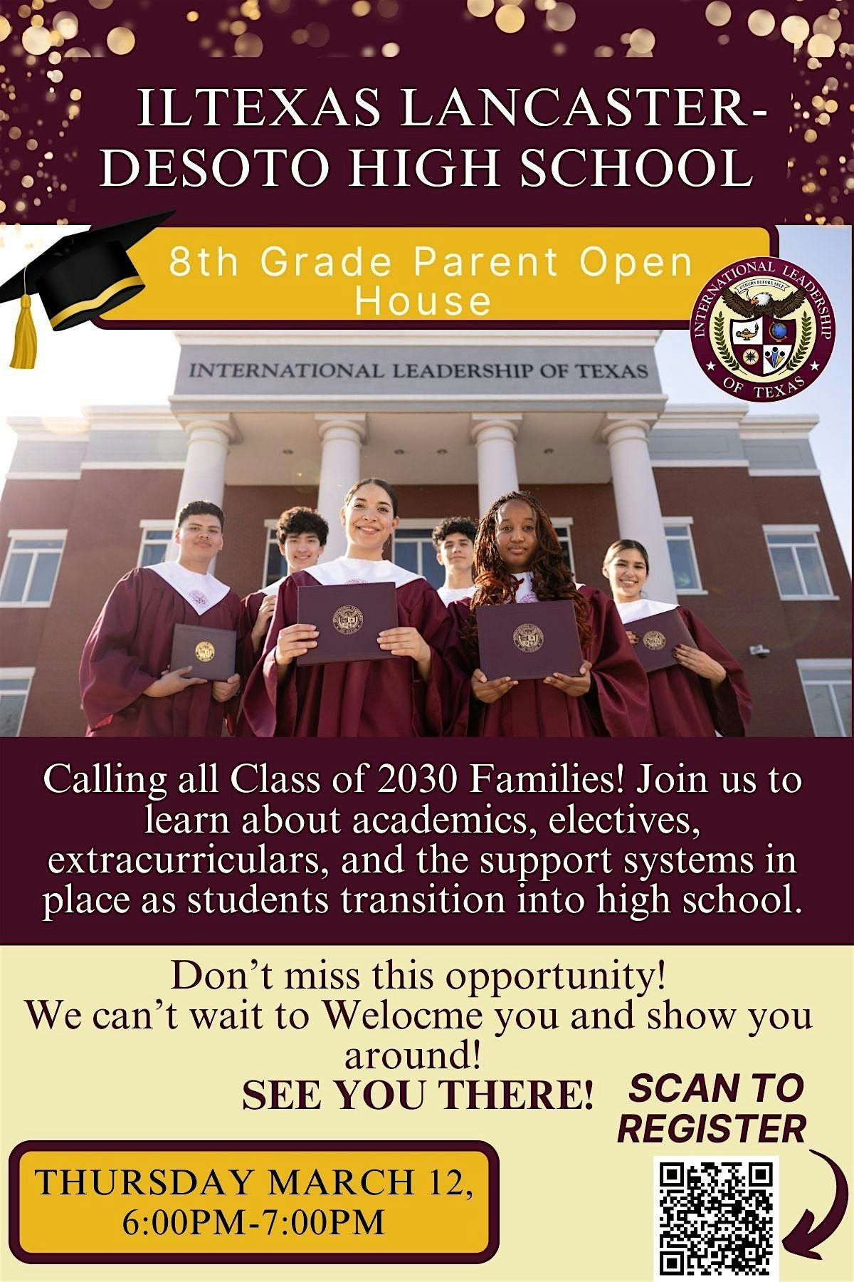 Calling all Class of 2030 families! Join us for the Lancaster–DeSoto HS 8th Grade Parent Open House on March 12, 2026, from 6:00–7:00 PM to learn about academics, electives, extracurriculars, and the support systems in place as students transition into high school.