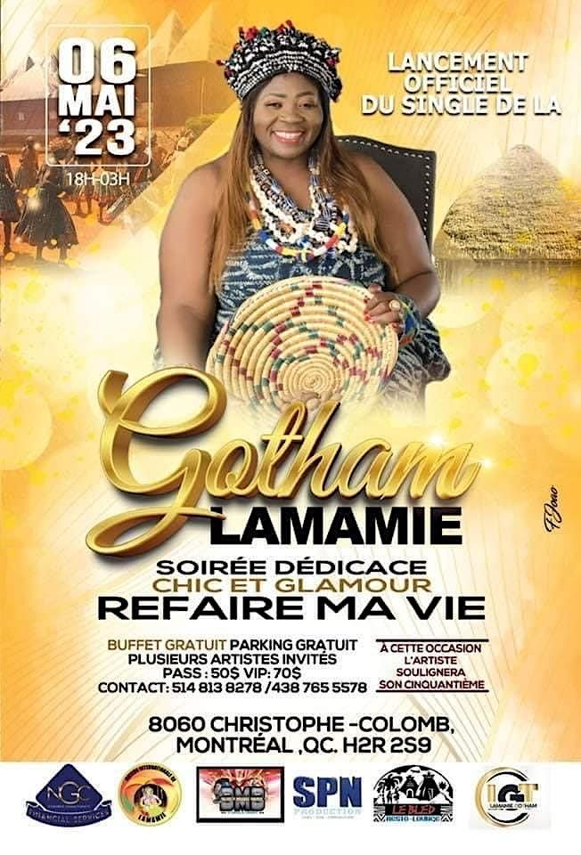 La soirée dédicace pour le lancement officiel du single REFAIRE MA VIE de l’artiste Camerquoise LAMAMIE GOTHAM qui se tiendra le 06 Mai 2023