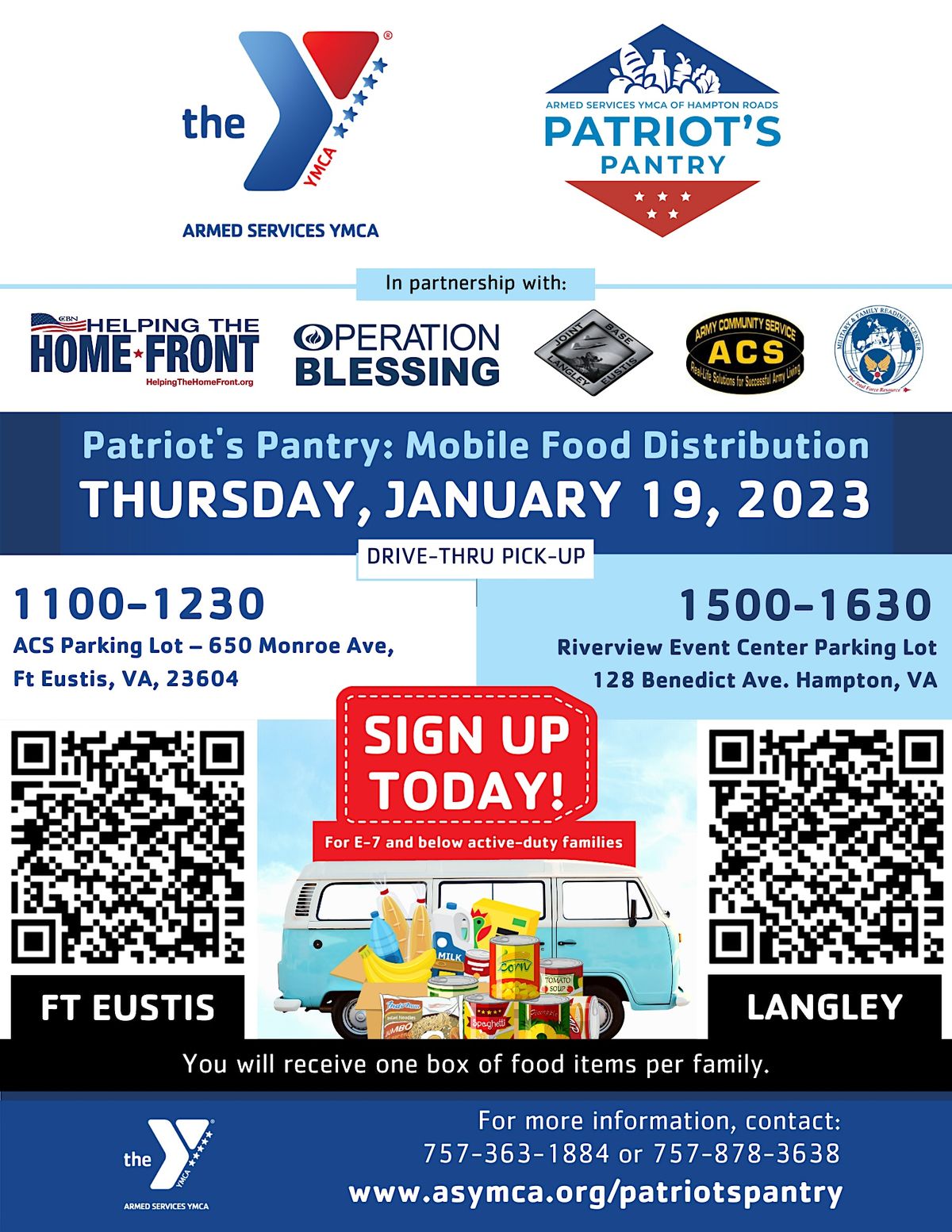 The Armed Services YMCA of Hampton Road's Patriot Pantry and CBN’s Helping the Home Front military project are happy to bring boxes of nutritious food to pass out to Active duty military members (E-7 and below) every third Thursday of each month. This is a drive-thru event, so no need to worry about hauling the box of food being provided to your car. The event will take place from 1500-1630. Please register beforehand and have an active duty or dependent military ID ready to confirm registration at check-in.