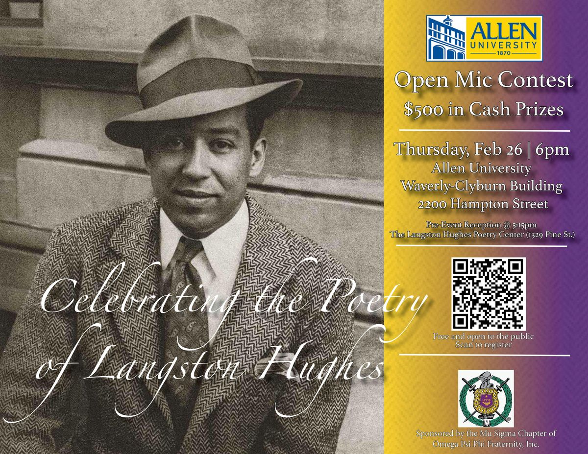Allen University's Langston Hughes Poetry Center and the Mu Sigma Chapter of Omega Psi Phi Fraternity, Inc. invite you to participate in an open mic poetry competition on Thursday, February 26.