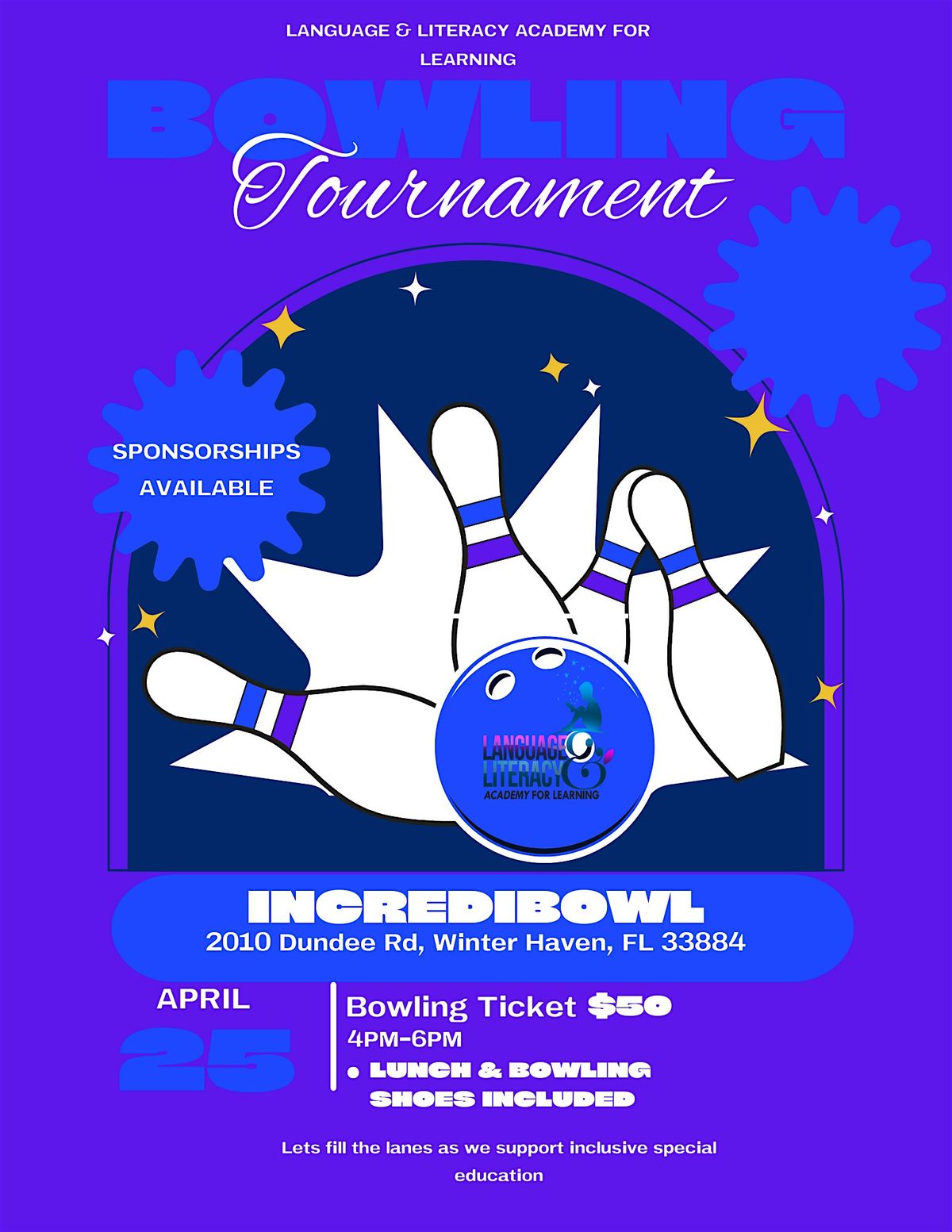 Get ready for a fun-filled day in person with friends, strikes, and smiles! Whether you're a pro or just here to enjoy, this tournament is all about raising funds to support special education during Austism Awareness month. Our misison at LLAL is to accelerate growth in language, literacy, and social skills for students with special needs while engaging parents as partners in education. Every sponsorship and ticket will be aiding in the expansion of our building to continue with our mission as we reach further depths of our community. Grab your bowling shoes and do not miss out!
