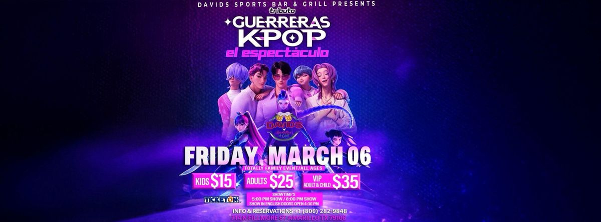 Don't miss LAS GUERRERAS K-POP 8 PM happening at David's Sports Bar & Grill, Amarillo, TX, United States on 2026-03-06T20:00:00-06:00. A great evening with good music and a laid-back atmosphere awaits you. Invite your friends for a night out! **Event Details:** * **Location:** David's Sports Bar & Grill, Amarillo, TX, United States Book your attendance today and be part of something extraordinary. #LASGUERRERASK-POP8PM #event #exciting #AmarilloEvents #TXEvents
