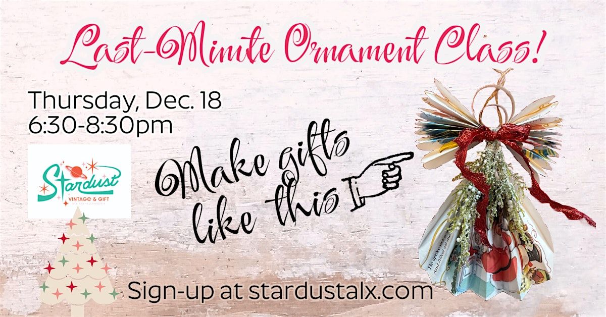 Last-Minute Ornaments Class — Transform book pages into charming holiday ornaments! Discover easy techniques to craft unique, literary-themed decorations perfect for last-minute gifts or personal touches on your tree. In this class, you’ll create a variety of designs while learning folding, cutting, and decorating tips. Suitable for all skill levels, with materials included. Leave with a set of beautiful, handmade ornaments ready to impress.