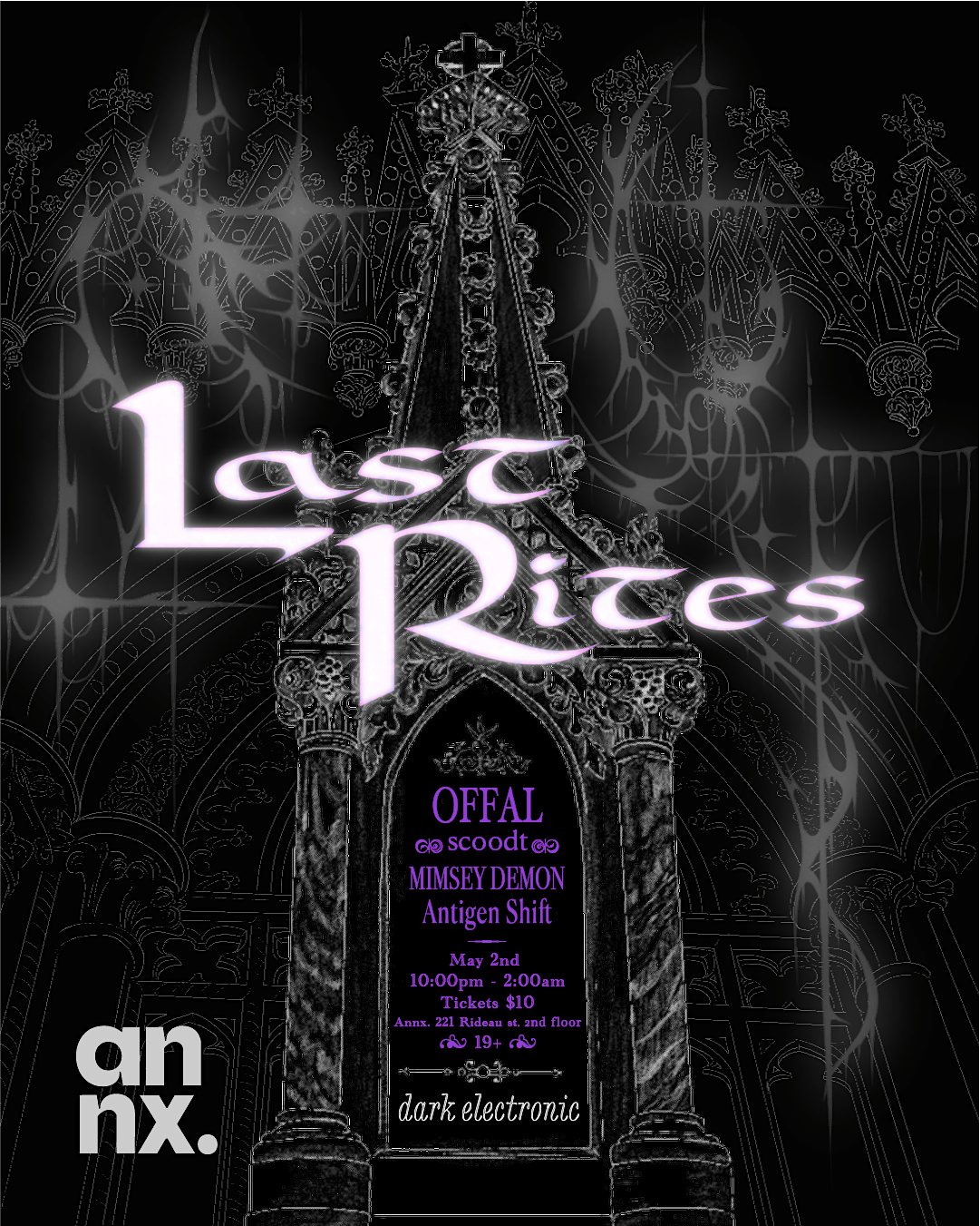 Fall and submit your dark confessions. Explore the hottest new night of underground electronic music at Annx with LAST RITES the newest collective produced by some of the best underground DJs in Ottawa, Scoodt, Mimsey Demon and Offal are planning on making the freshest events you’ll love to wear the coolest outfits you have. Follow Last Rites on all socials for more details.
