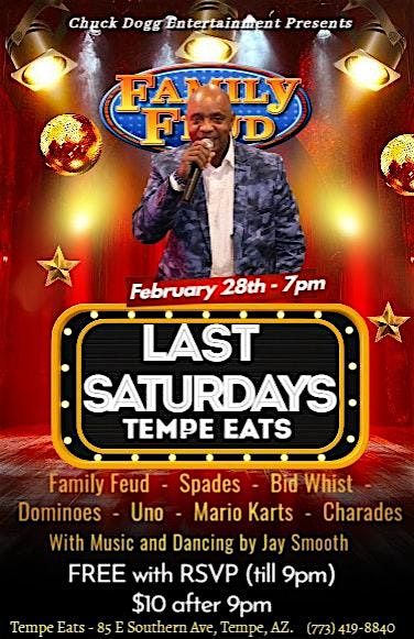 - Family Feud LIVE! – Two teams compete head-to-head just like the TV show, hosted by Chuck Dogg and the Game Night Arizona crew. ($10 to play). Winning team plays fast money for a chance to win $200.00